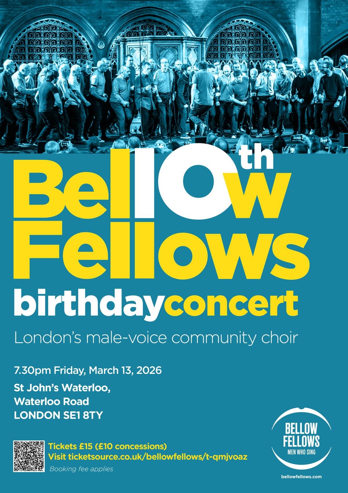 Bellow Fellows is London's male voice community choir and meets regularly in central London. There are no auditions and everything is taught by ear.